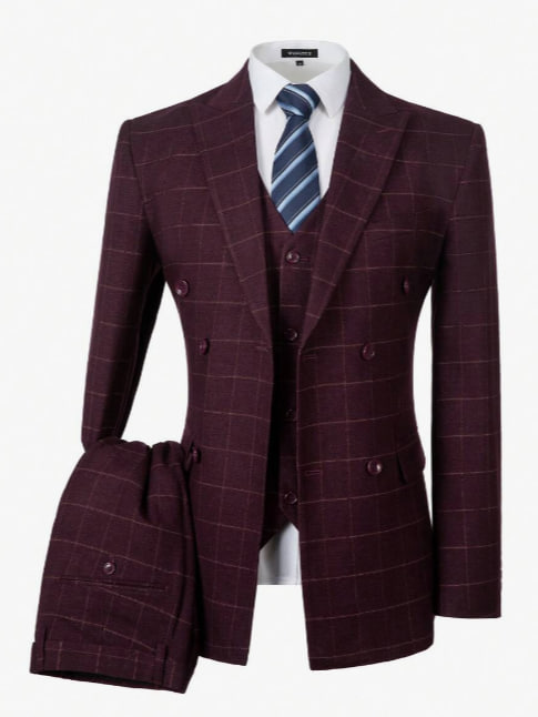 Men's 3pc Set Of Double Breasted Notch Lapel Plaid Suit Jacket, Single Breasted Vest And Dress Pants